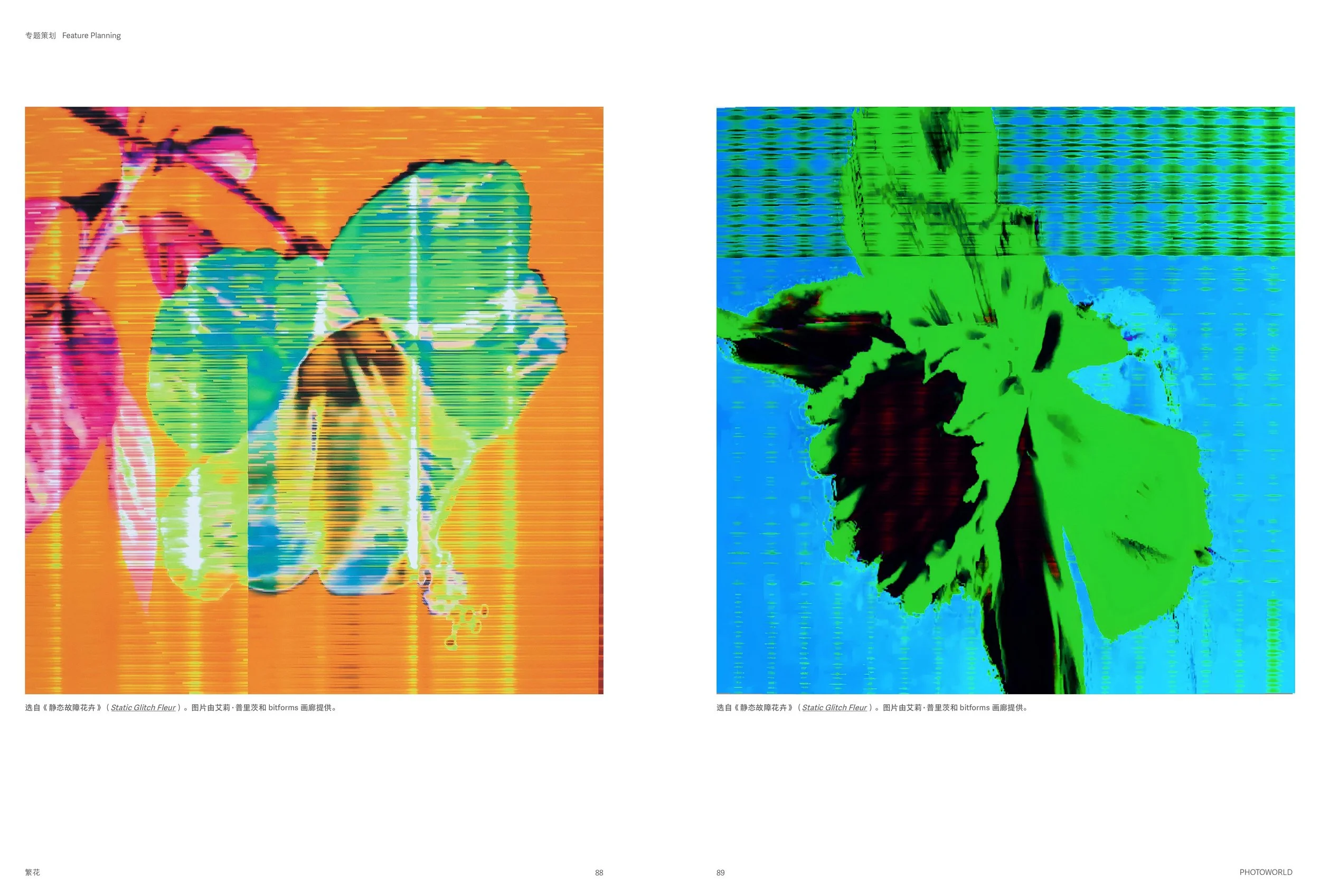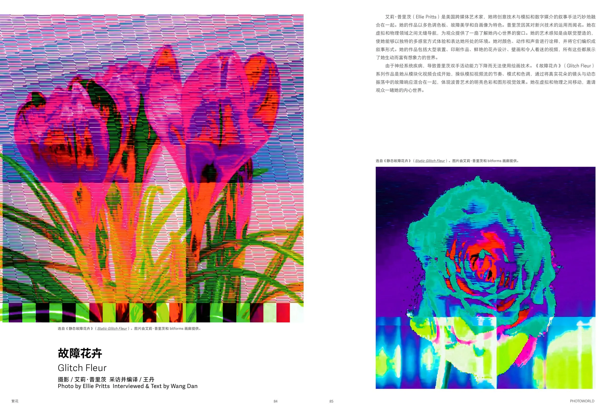 Due to a neurological condition, Pritts' hand movements have become limited, preventing her from using traditional painting techniques. The Glitch Fleur series began with modular video synthesis, where she manipulated the rhythm, patterns, and tones of analog video streams, blending footage of real flowers with glitch responses in dynamic oscillation, embodying the bright colors and graphic visual effects of pop art. She moves between the virtual and physical, inviting the audience to glimpse into her inner world.