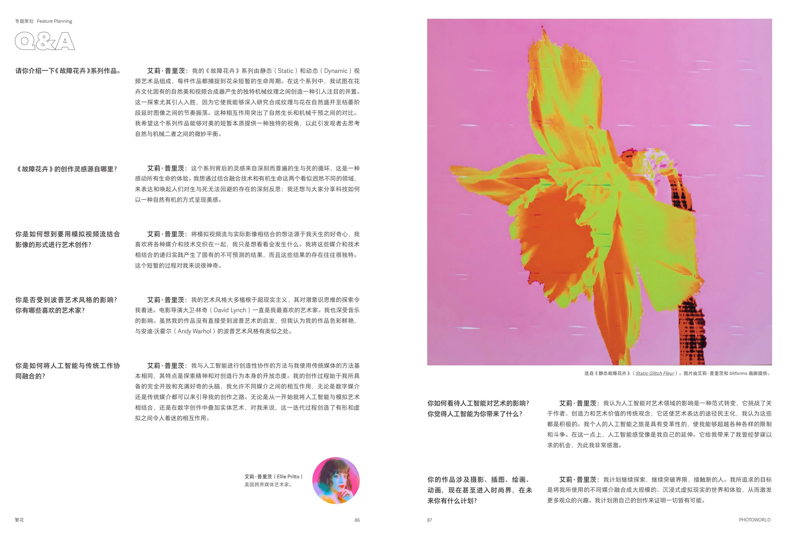 Ellie Pritts is an American new media artist who skillfully blends creative technology with both analog and digital narrative techniques. Her work is characterized by a multi-color palette, glitch aesthetics, and self-portraiture. Pritts is renowned for her use of emerging technologies. She navigates seamlessly between the virtual and physical realms, offering viewers a window into her inner world. Her artistic perception is shaped by synesthesia, allowing her to experience and express her surroundings in a uniquely multi-sensory way. She interprets colors, movement, and sound, weaving them into narrative forms. Her work includes large-scale installations, prints, vibrant floral designs, murals, and captivating videos, all of which showcase her vivid and imaginative world.
